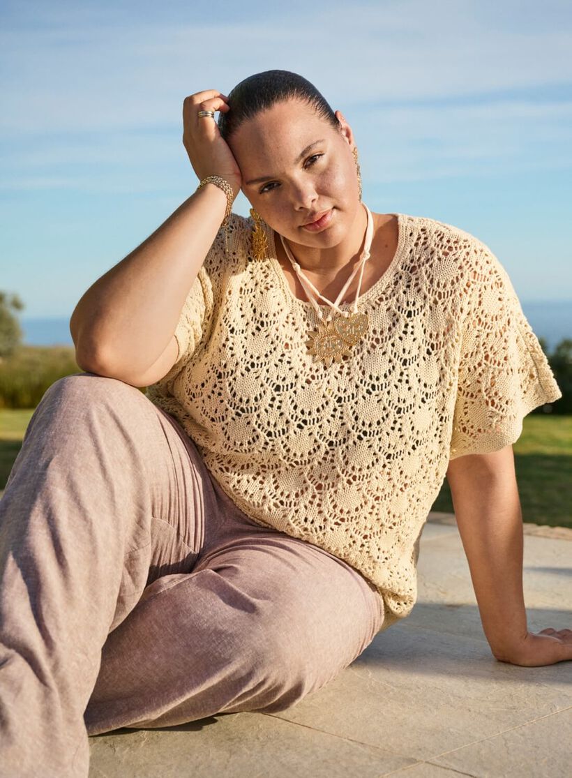Superfin stickad blus i ett mjukt och skönt material med 50 % ekologisk bomull. Den stickade blusen har ett dekorativt hålmönster, rund halsringning och korta fladdermusärmar.