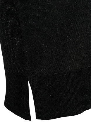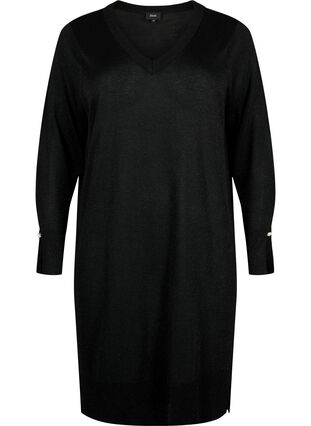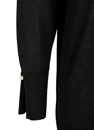 Feminin stickad klänning med glitter över hela, tillverkad av mjuk viskos. Klänningen har v-ringning, långa ärmar med slits och pärldetalj, samt slits i sidan.