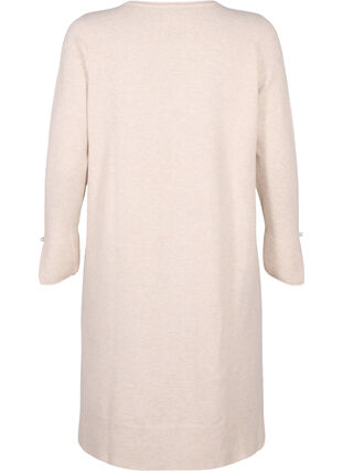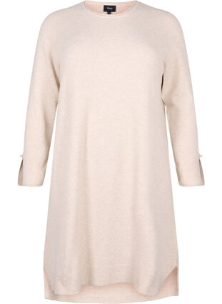 Melerad, stickad klänning med lös och bekväm passform och slits i sidan. Klänningen är tillverkad av 94 % återvunnen polyester och har långa ärmar med slits och pärlknapp.