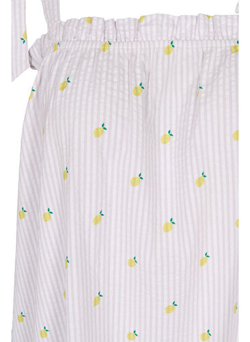 Superfin strandklänning i 100% bomull med struktur och citronmönster. Klänningen har en rak halsringning med volangkant, justerbara band, skärning i nedre delen med volangdetaljer och en lös A-linjeformad modell.