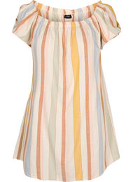 Tunika i bekväm viskoskvalitet med off-shoulder-modell och fint randigt mönster. Tunikan har resår i ärmslut för en lätt ballongeffekt.