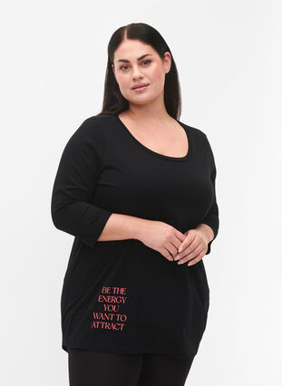 Mjuk t-shirt i bomullmaterial med 50% ekologisk bomull. T-shirten har en enkel design med texttryck på framsidan, rund hals och 3/4-ärmar.