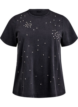 T-shirt i 100% ekologisk bomull med en cool, tvättad look och dekorativa strass framtill och på axlarna. Stilen har rund halsringning, korta ärmar och normal passform, vilket ger en avslappnad och feminin look.