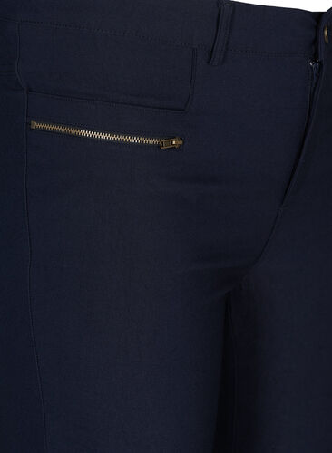 Enkla enfärgade byxor med 3/4 längd, tillverkade i en bekväm viskosmix med stretch. Byxorna har en tight passform och dekorativa detaljer med blixtlås framtill.