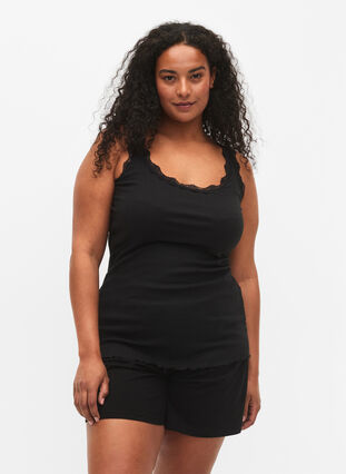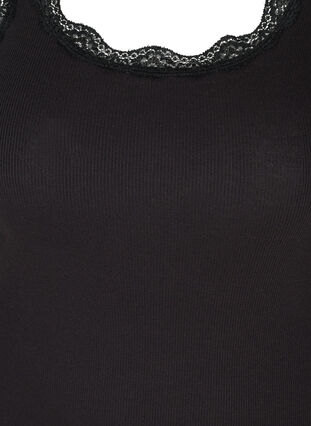 Snygg och feminin bastopp i ett fint ribbat material. Toppen har en vacker spetskant vid ärmar och hals.