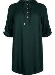 Tunika i 100% viskos med huva och snören. Den har långa ärmar med möjlighet till uppslag, dekorativa knappar framtill och ett snitt baktill som ger tunikaen en lätt drapering.