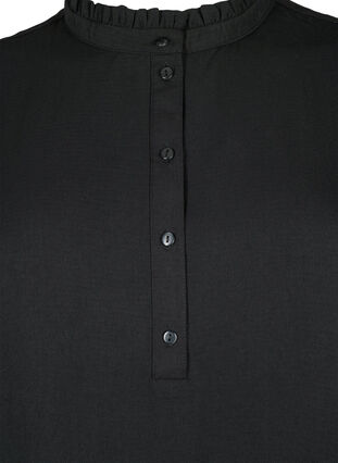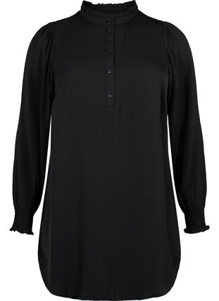 Klassisk tunika med lös passform, långa ärmar med smockfinish och små veck på baksidan för en lätt drapering baktill. Tunikan har en feminin volangkrage och knappstängning vid bröstet.
