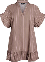 Tunika med korta, vida ärmar och volangkant, V-ringning med volangkrage och lös passform som avslutas med en bred volangkant. Tunikan är tillverkad i 100% bomull och finns i randiga, mönstrade och enfärgade varianter.