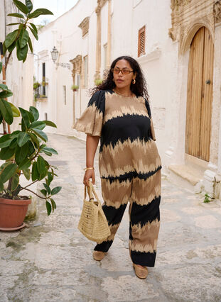 Byxor med ett effektfullt grafiskt tryck bestående av breda, horisontella ränder i kontrasterande färger, tillverkade i ett mjukt och lätt kvalitetstyg med 83 % Livaeco™ viskos och 17 % återvunnen polyamid. Byxorna har en hög midja med elastisk linning, sidofickor och en bekväm rak passform med lösa, luftiga ben som skapar ett fint fall från höfterna och nedåt.