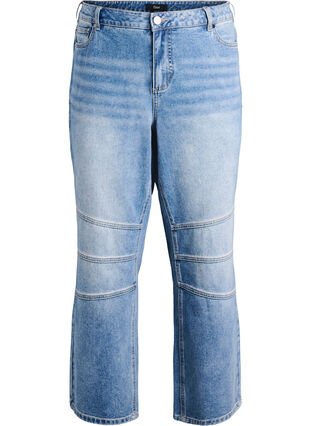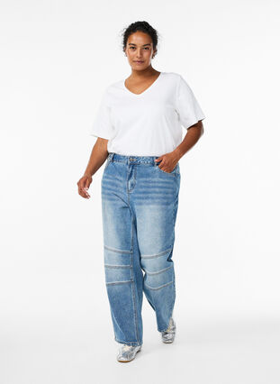 Jeans med bred passform, hög midja och invändig justerbar resår i midjan för komfort och flexibel passform. Jeansen har en lös silhuett från höft till fåll och vida ben, vilket skapar en avslappnad men ändå snygg look. De är designade med sömdetaljer över låren, vilket ger en extra touch. Den klassiska 5-ficksdesignen avslutas med knapp och gylf med dragkedja, medan den ljusa tvätten betonar jeansens avslappnade stil.