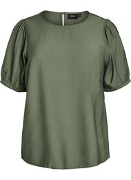 Blus med rund halsringning och nyckelhålsknäppning baktill. Halvlånga ärmar med smala manschetter som skapar en lätt puffeffekt. Normal passform. Blusen innehåller 87% LENZING™ ECOVERO™ Viskosfibrer, vilket ger ett naturligt fall och mjukhet.