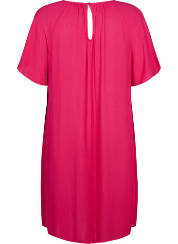 Enkel klänning med korta ärmar och rund halsringning med knappstängning i nacken. Klänningen har små fall längs halsringningen, vilket ger ett fint fall för den lösa passformen. Den här klänningen innehåller 100 % LENZING™ ECOVERO™ Viscose-fibrer som ger naturlig mjukhet och fall.