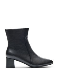 Ankelstövel i läderimitation med bred passform och extra vidd i skaftet. Den här modellen har en mandelformad tå, en 3,5 cm blockklack och en dragkedja på insidan, tillsammans med en diskret elastisk insats som ger en flexibel passform runt ankeln. Stöveln har även plats för inläggssulor.