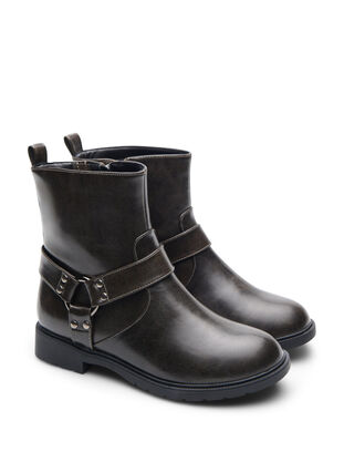 Coola bikerboots med en edgy look och dekorativa detaljer. De är gjorda i läderimitation och har en iögonfallande O-ring och breda remmar med små nitar runt vristen. Bootsen har en kort, bred skaft, rund tå, stadig yttersula med halkfritt mönster och en praktisk dragkedja på sidan som gör dem lätta att ta på och av.